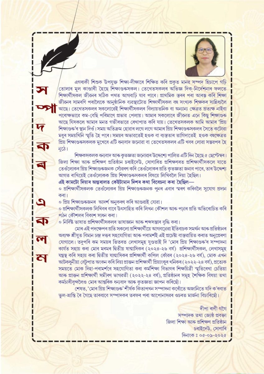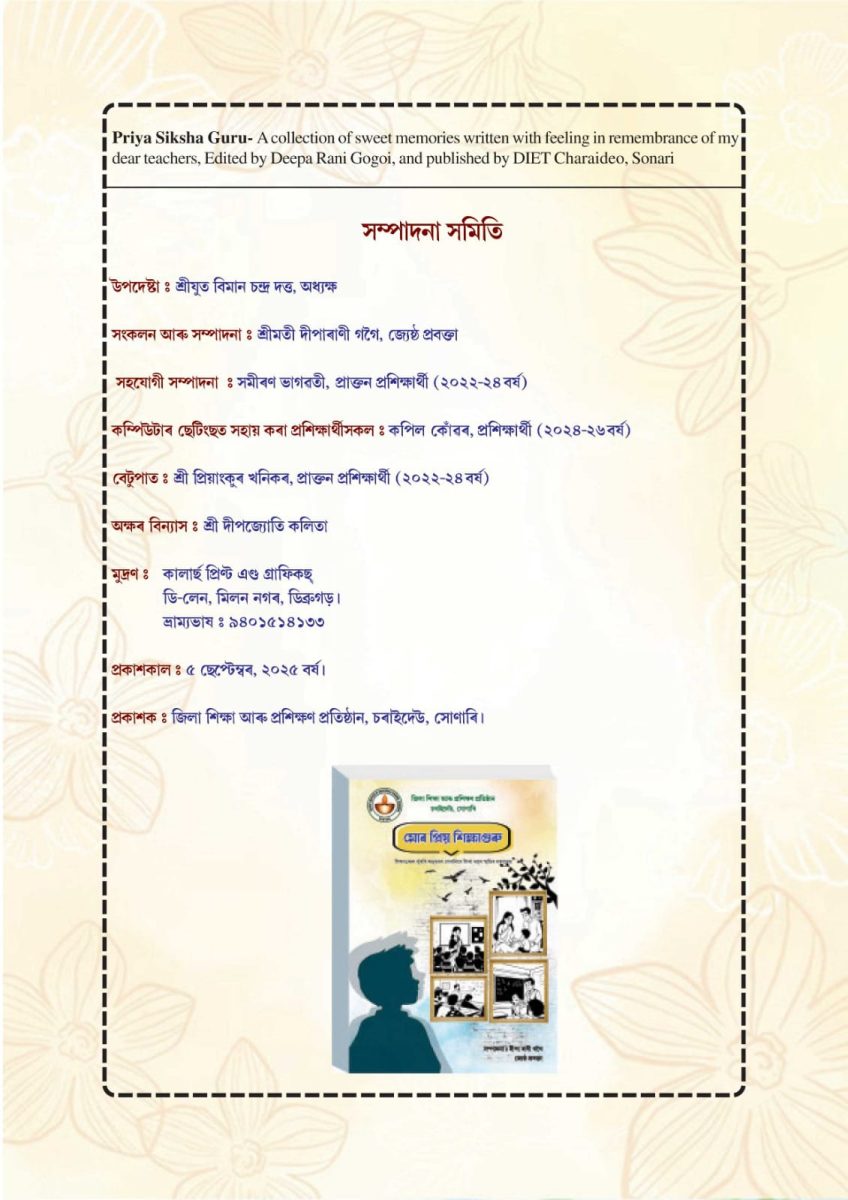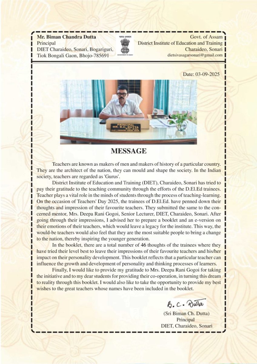 This initiative of publishing a commemorative book on Teachers’ Day was introduced at DIET Charaideo in the previous year and has since continued as a tradition. The book was edited by Smt. Deepa Rani Gogoi, Senior Lecturer, with associate editing by Samiran Bhagwati, a trainee of the 2022–24 batch. The background design for the book was prepared by Priyankur Khanikar, also a trainee of the 2022–24 batch.